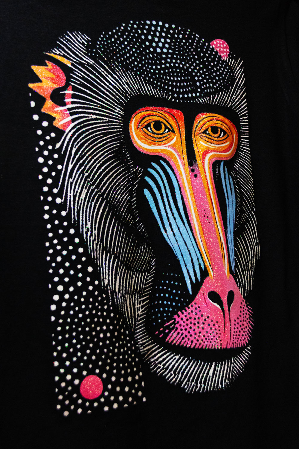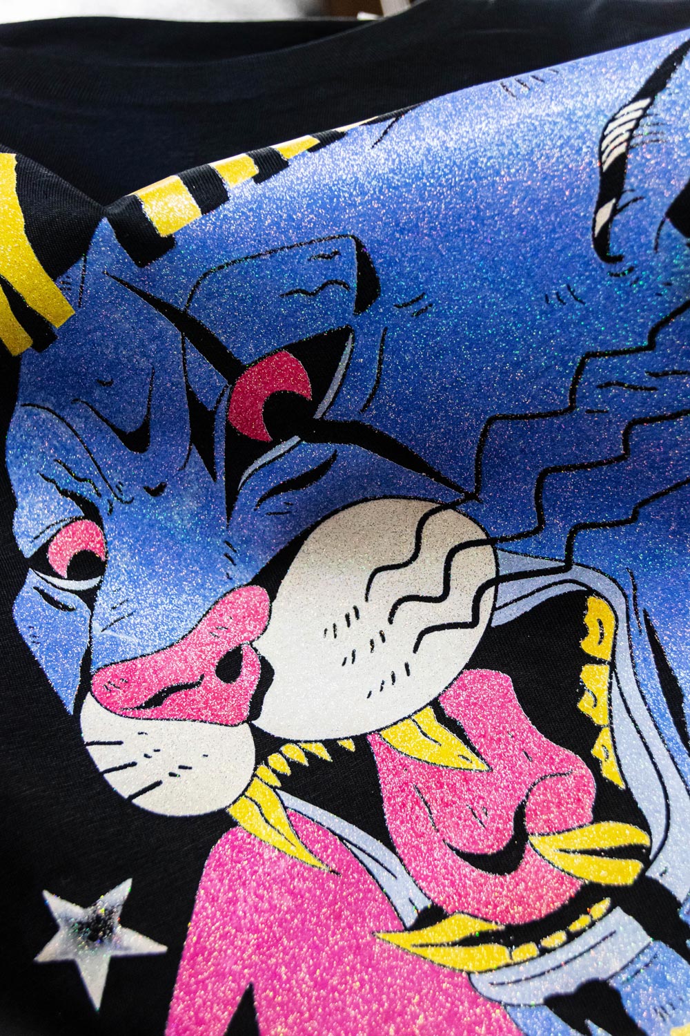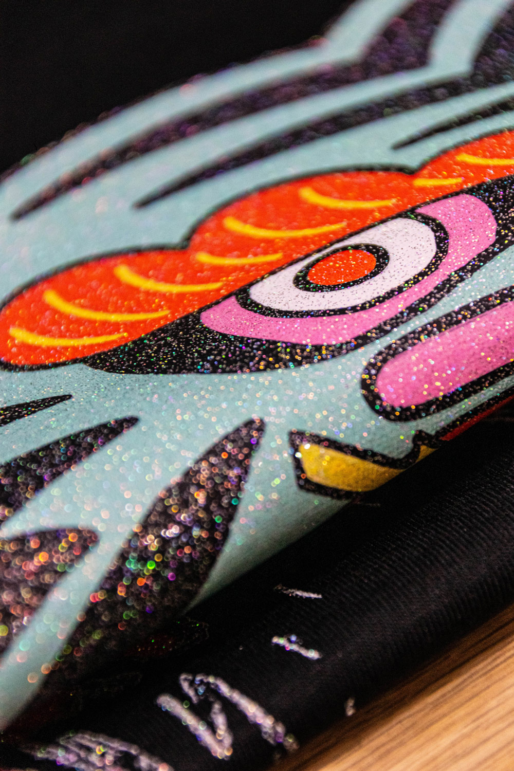 La stampa è integrata con micro-cristalli riflettenti che generano un effetto cangiante multicolore. La grafica brilla e cambia riflesso a seconda di come viene colpita dalla luce, con una finitura materica al tatto e coprente.